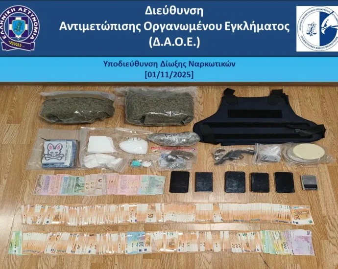 04-11-2025: -3- συλλήψεις από τη Δ.Α.Ο.Ε. για κατοχή και διακίνηση ναρκωτικών ουσιών στην ευρύτερη περιοχή του Πειραιά- Κατασχέθηκαν πάνω από 2,1 κιλά κοκαΐνης, 2,1 κιλά κάνναβης, -2- περίστροφα, αλεξίσφαιρο γιλέκο κ.α.